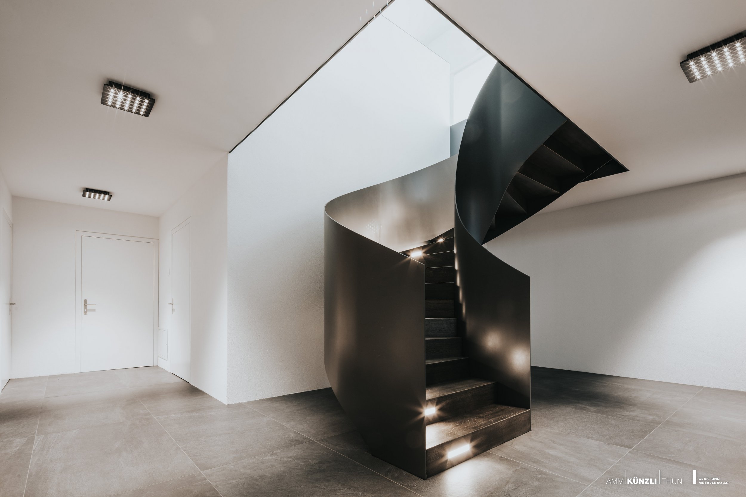 Geschwungene Treppe aus Metall als Augenweide im Zentrum des Hauses oder imposante Eingangsfront.